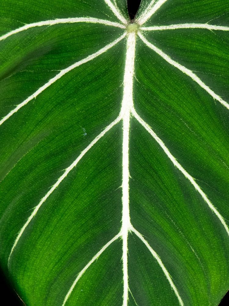Feuille en forme de cœur, d'un vert profond, avec des nervures blanches qui partent du centre comme des lignes serrées. Le noir foncé de l'arrière-plan fait ressortir la feuille avec encore plus de force, donnant à sa forme et à sa structure un aspect presque graphique et artistique. La feuille respire l'élégance et la simplicité, un exemple parfait de symétrie naturelle.