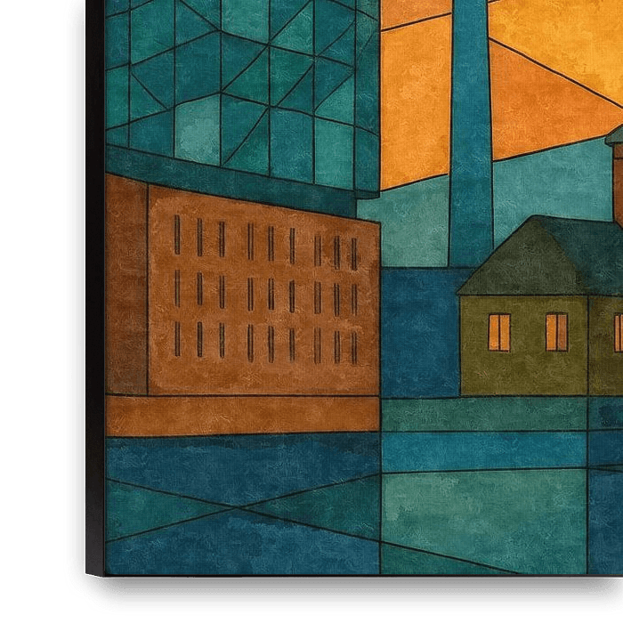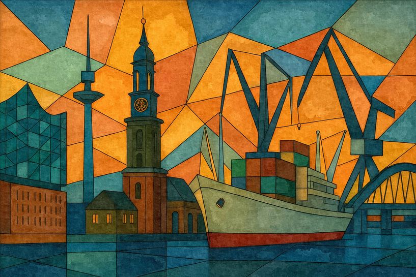 Un panorama portuaire vibrant qui réunit la puissance industrielle et la diversité culturelle de Hambourg dans une mosaïque géométrique. La vue sur les porte-conteneurs, les grues, les ponts et les bâtiments emblématiques comme l'Elbphilharmonie, le Michel et la tour de télévision est contrastée par les couleurs chaudes du soleil et les…