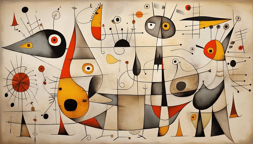 Cette œuvre d'art vibrante est une composition dynamique pleine de figures imaginatives, fortement influencée par le style surréaliste de Joan Miró. Le fond pittoresque aux teintes marron clair et sableuses crée un espace ouvert et rêveur dans lequel un défilé de créatures abstraites prend vie. Les figures sont un mélange de formes…