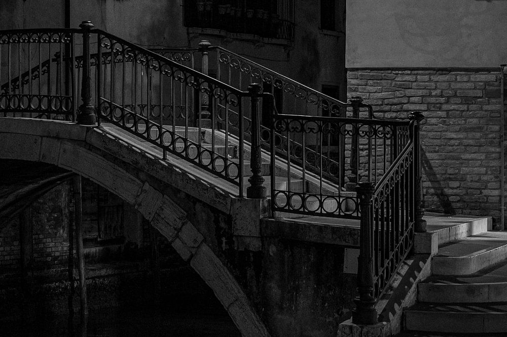 Au pied de nombreux ponts de Venise, on trouve de petites boutiques. J'ai pris cette photo en début de soirée, alors qu'un dernier client passait sa commande. L'atmosphère me rappelle le célèbre tableau d'Edward Hopper, Nighthawks. La solitude n'est jamais loin à Venise.