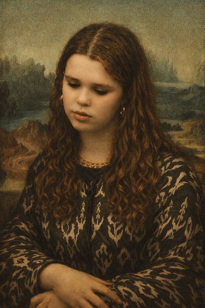 Dans cette œuvre, le regard de la jeune femme se pose comme un murmure sur la toile, doux et feutré, comme si elle écoutait des pensées qu'elle seule peut entendre. Ses yeux baissés ne portent aucune lourdeur, mais un abandon tranquille à l'instant présent, un calme qui ne se laisse pas bousculer. L'éclat chaud de sa peau et le brun doux de ses cheveux se fondent dans le paysage derrière elle, où les collines s'estompent dans la brume et où le temps se dissout dans la respiration. L'arrière-plan ne semble pas seulement un lieu, mais un souvenir - un monde qui existe entre ce qui a été et ce qui est encore à venir. Ses mains, calmement croisées, parlent de patience, d'attente sans agitation. L'or de son cou et de ses oreilles accroche la lumière comme de petites promesses, de subtils échos du présent dans une peinture qui respire comme quelque chose d'ancien. Il n'y a pas de sourire, mais pas de tristesse non plus. Seulement une présence silencieuse, comme si elle était consciente de l'œil qui la voit, mais qu'elle ne voulait pas se dévoiler complètement. Dans sa pose se trouve une douce résistance à l'explication, une invitation à la contemplation sans réponse. "Le doux silence du temps invite le spectateur non pas à regarder, mais à rester - à se perdre dans le calme entre deux pensées, là où la beauté ne crie pas, mais chuchote. Ici, l'instant ne devient pas une seconde, mais une éternité, capturée par la peinture, le souffle et la lumière.