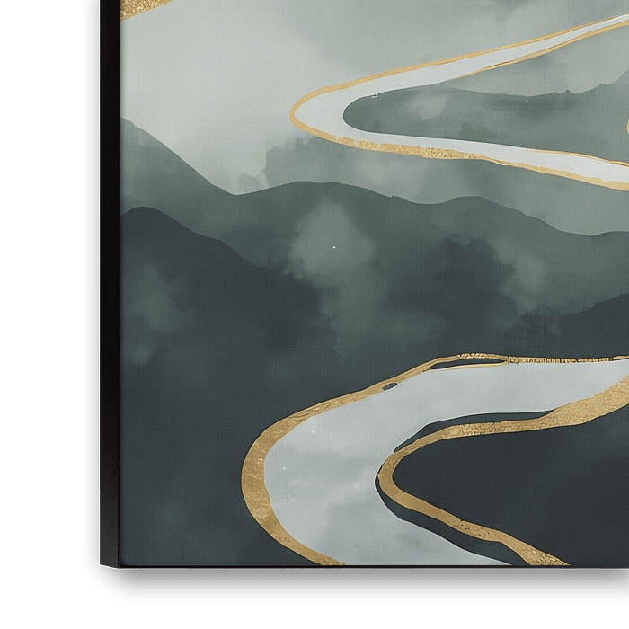 La rivière d'or est une œuvre d'art enchanteresse et atmosphérique qui emmène le spectateur dans un paysage de montagne rêveur où la lumière et le mouvement se renforcent mutuellement. Les collines légèrement étagées, rendues dans des tons calmes de bleu-vert et de gris brumeux, forment un arrière-plan serein qui se dissout lentement…