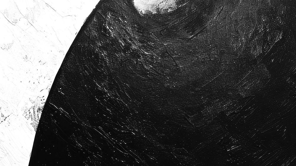 Une peinture abstraite avec un fort contraste entre le noir et le blanc. L'œuvre d'art représente une grande demi-lune sur un fond blanc qui se détache nettement d'un champ sombre, presque entièrement noir.