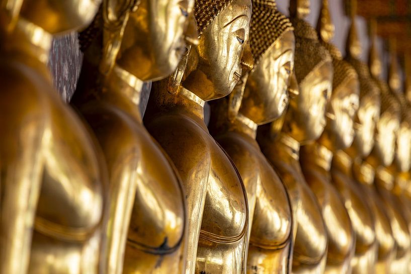 Un flot doré de silence parcourt les salles du Wat Suthat Thepwararam. Les statues de Bouddha dorées, chacune dans la posture Bhumispara-Mudra, immortalisent le moment où Gautama touche la terre et atteint l'illumination. Leurs visages sont empreints d'une sérénité qui rayonne à travers les siècles, une sérénité qui enveloppe le visiteur comme un chant silencieux. La lumière glisse sur les surfaces polies, transformant l'or en éclat, l'éclat en une aura presque surnaturelle. La répétition des figures crée un rythme, un mantra visuel qui conduit l'esprit vers les profondeurs. Chaque regard sur la rangée est en même temps un regard sur son propre paysage intérieur : reflets de clarté, de désir de connaissance. Le temple royal au cœur de Bangkok porte ces figures comme un trésor, un héritage de la puissance spirituelle de l'Asie. Ici, dans le quartier de Phra Nakhon, l'histoire et le présent se confondent. Les statues ne sont pas seulement des œuvres d'art, mais aussi des symboles vivants d'une vérité qui transcende le temps et l'espace. En s'attardant, on sent le silence parler : de la terre qui témoigne et de l'homme qui, au moment de l'illumination, ne fait plus qu'un avec le cosmos.