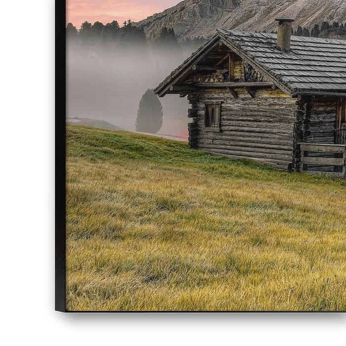 Vue panoramique sur le Peitlerkofel au col du Würzjochpass avant le lever du soleil avec des cabanes en bois idéalement situées au premier plan. Il y a encore un léger brouillard sur le paysage qui se dissout de plus en plus.