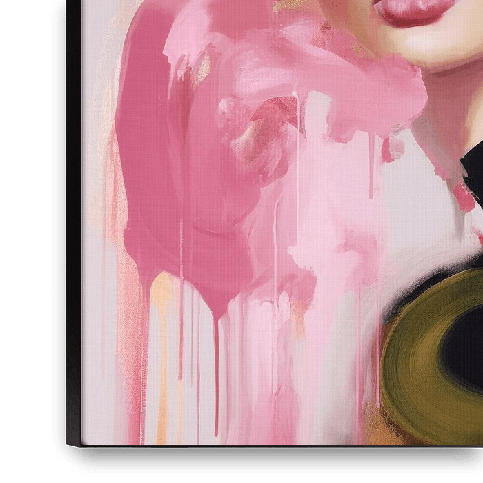 Portrait moderne intitulé : "The world looks better in pink" ;. Un véritable accroche-regard sur votre mur dans des tons principalement roses !