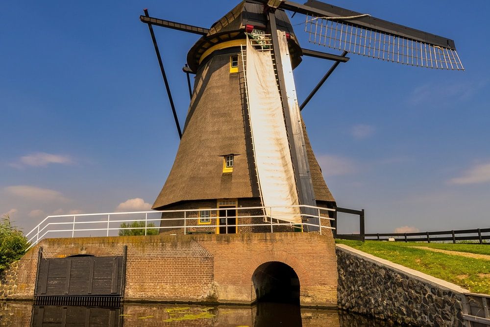 Un des moulins à vent du site du patrimoine mondial de Kinderdijk. Ces moulins maintiennent le niveau de l'eau le long des digues au bon niveau. Une belle journée avec des nuages hollandais et de nombreux contrastes de couleurs ont fait de cette photo une réussite.