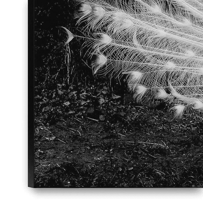 Dans un monde de contrastes, elle se tient là, véritable incarnation de la grâce et de la délicatesse. Sur un fond d'ombres noires et profondes et de lumière chuchotant dans des tons monochromes, une majestueuse paonne blanche brille comme un symbole de beauté raffinée. Sa présence forme un contraste enchanteur avec l'obscurité qui l'entoure, ses plumes étant comme de doux coups de pinceau sur la toile de la nuit.