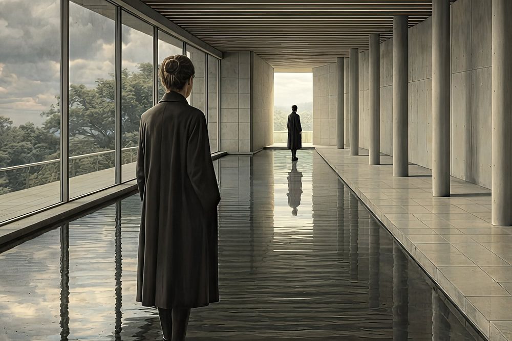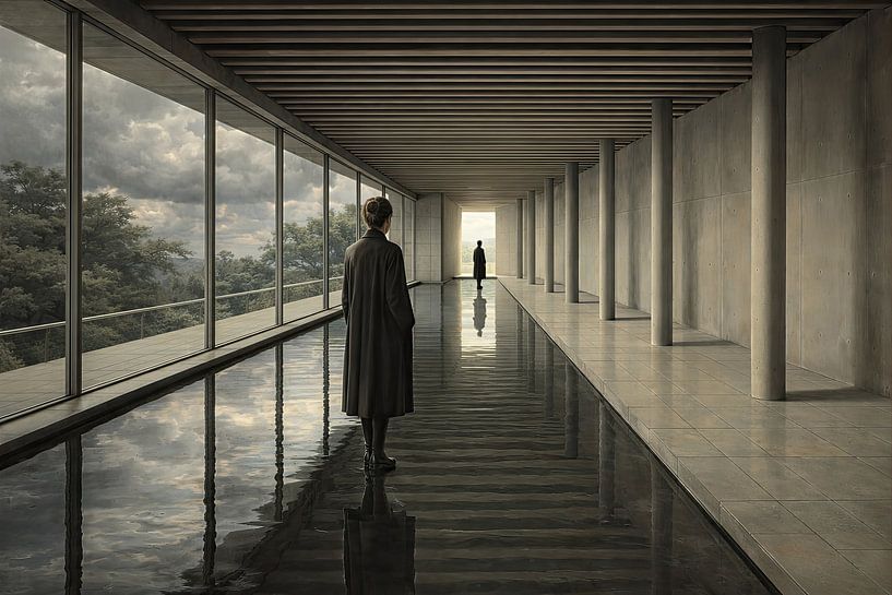 Dans 'The Measured Passage', l'espace se dévoile comme une structure intérieure. Deux personnages partagent une même architecture, séparés par une distance qui semble plus psychologique que chronologique. Le rythme des colonnes détermine le tempo de la perception ; chaque pas marque un changement de conscience. L'eau porte le reflet…