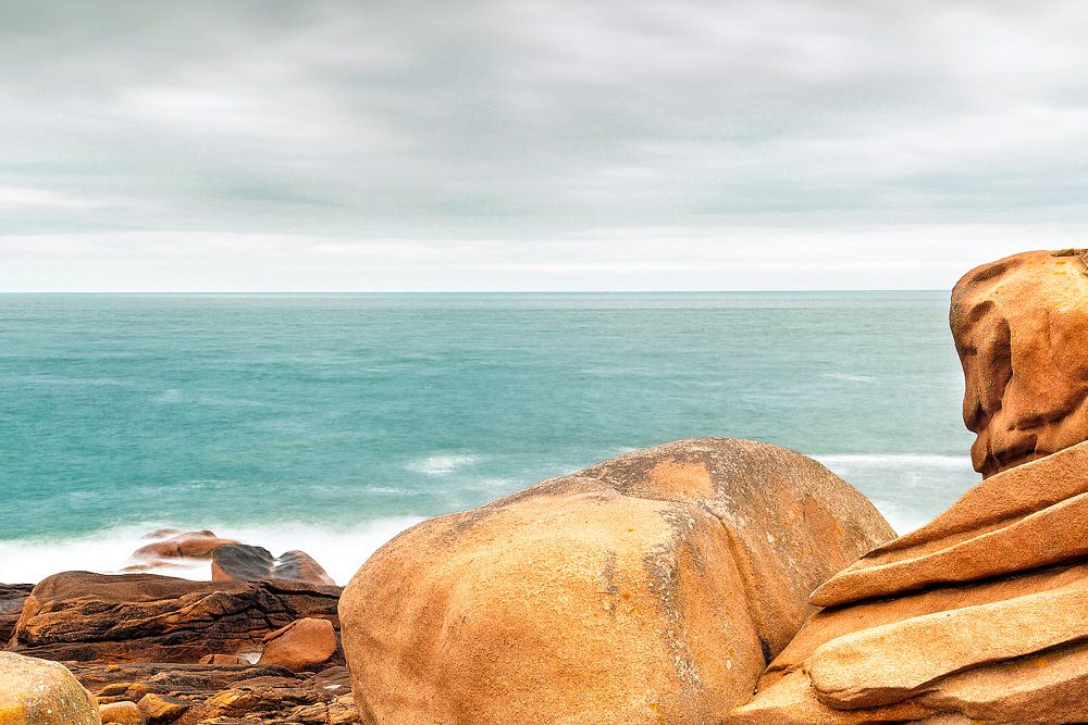 Le phare - Phare de Mean Ruz - situé le long du Sentier des Douaniers sur la Côte de Granit Rose près de Ploumanach, dans la région de Bretagne, sur fond de ciel menaçant et sombre. Les formations rocheuses de cette côte sont connues pour leur éclat rose. Cette photo a été prise lors d'une journée couverte en été 2015. Des filtres ND LEE ont été utilisés pour cette photo et une vitesse d'obturation de plusieurs secondes a été appliquée. Cette photo montre le phare emblématique de la Pointe du Raz en Bretagne, France. La haute tour cylindrique en pierre se dresse sur une pointe rocheuse entourée de gros rochers lisses. Le ciel est couvert avec un mélange de nuages sombres et clairs, créant une atmosphère dramatique. La mer est d'un bleu-vert profond, frappant les rochers au premier plan. Les briques rouges et les bords blancs du phare contrastent fortement avec les tons naturels des rochers. La photo dégage un sentiment d'isolement et de beauté sauvage.
