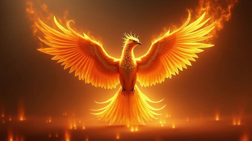 Phénix d'or déployant ses ailes de feu, symbolisant le renouveau, l'immortalité et la nature cyclique de la vie.