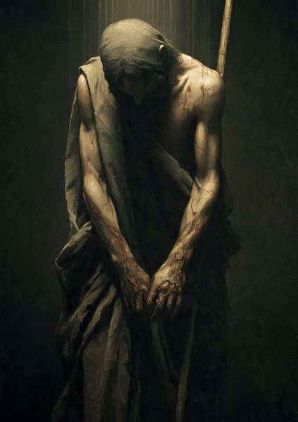 Une représentation artistique sombre et émotionnelle d'une figure christique endurant la souffrance et le fardeau spirituel. L'œuvre symbolise le sacrifice, la foi et la rédemption grâce à un éclairage dramatique et à un réalisme classique.