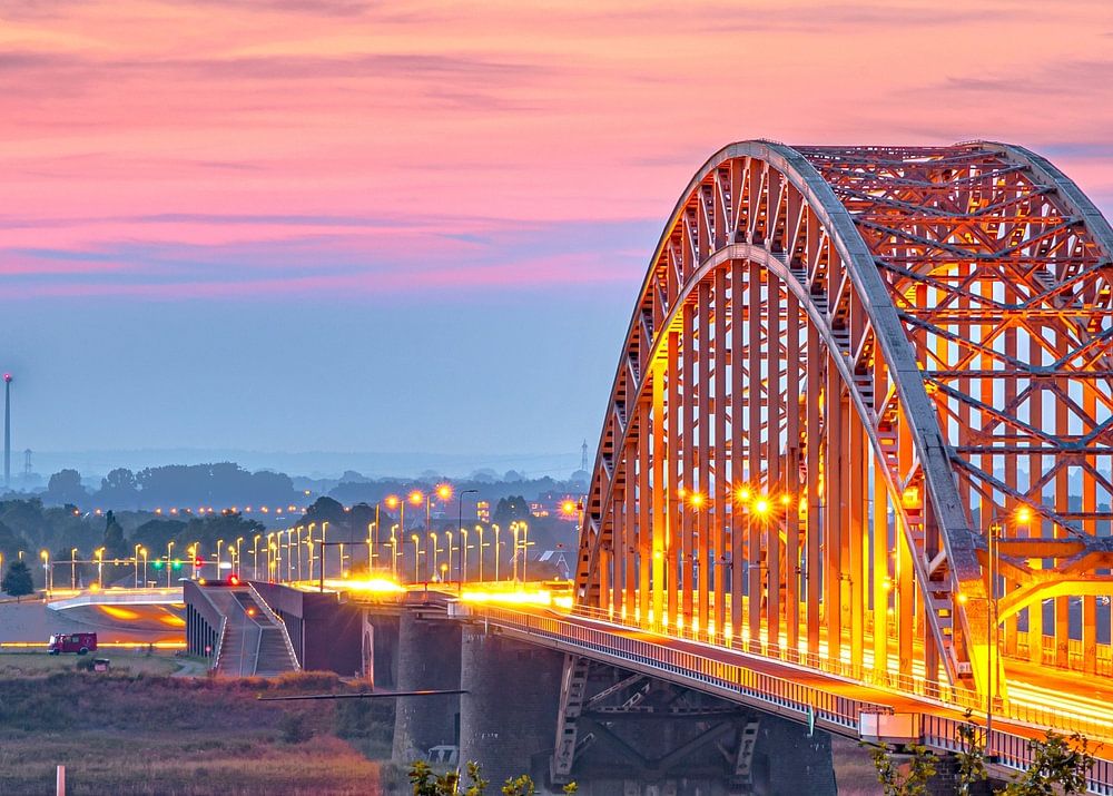 Le Waalbridge est un pont en arc sur la rivière Waal qui relie le centre de Nimègue à Carême. Le pont fait partie de la N325 et de la route urbaine S100. À deux kilomètres à l'ouest se trouve le pont urbain De Oversteek, ouvert en 2013. (Source : Wikipedia)