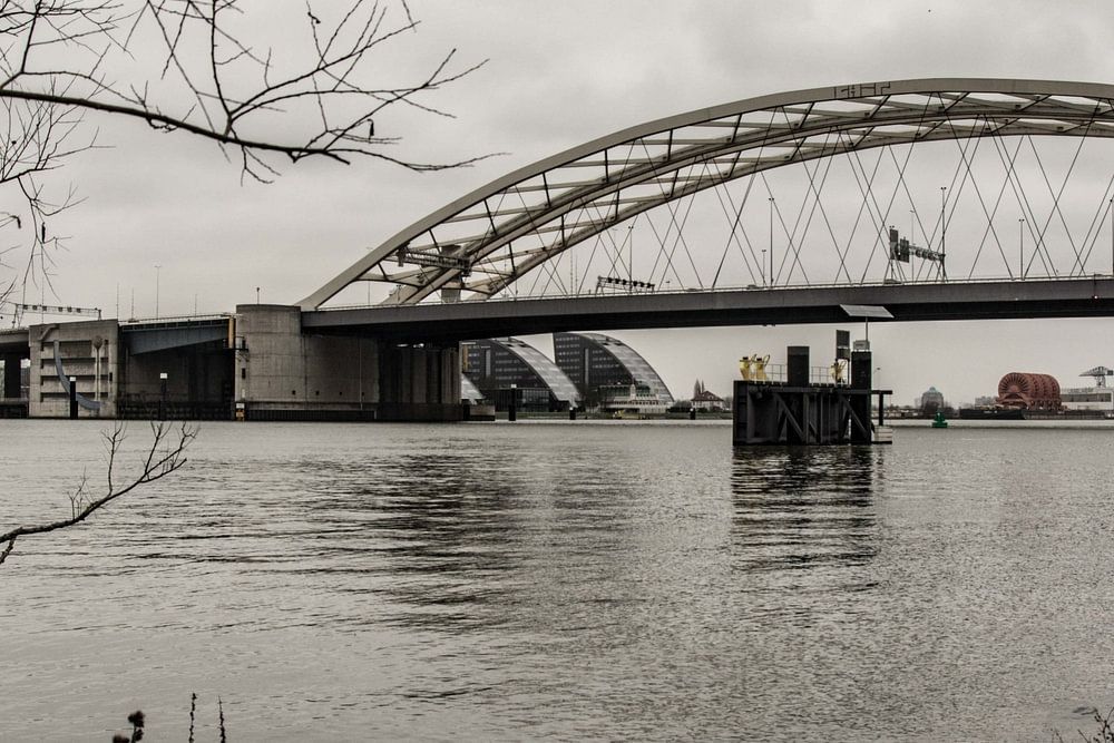 Le chassé-croisé de la journée d'hiver couvre de nuages l'imposant pont de Brienenoord photographié depuis l'île de Brienenoord. La beauté de l'aspect brut du pont et de la maison du saumon sur l'autre rive n'est qu'un point de repère, tandis que les grandes bobines pour la pose d'un câble dans le port ne sont jamais très loin. Il y a beaucoup à voir depuis le sud de Rotterdam et au-delà.