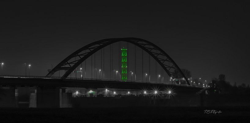 Le pont de la solidarité de Duisbourg en noir et blanc avec la tour de la Stadtwerke en couleur.