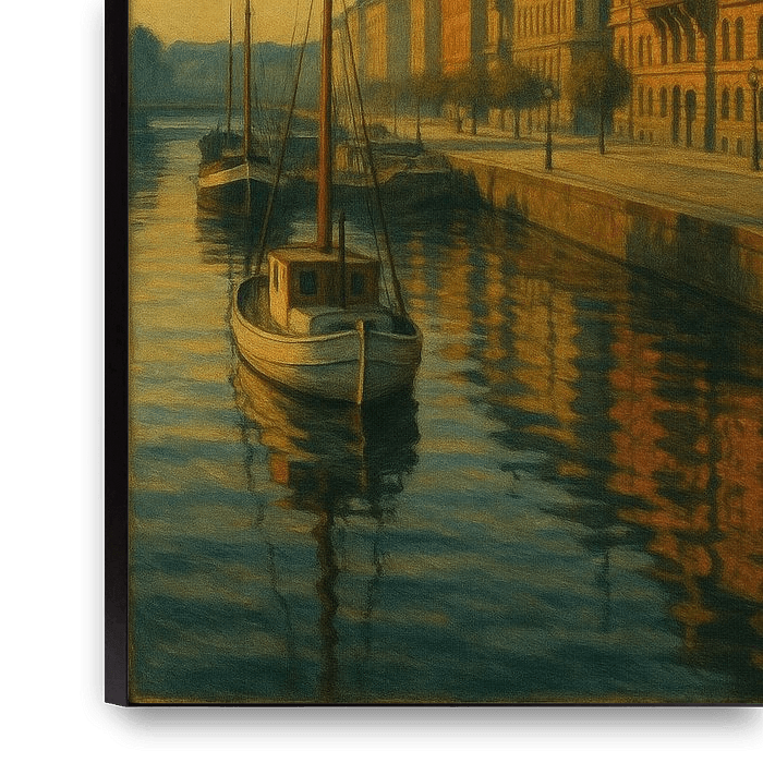 Cette élégante œuvre d'art capture la grandeur de Strandvägen, le boulevard le plus prestigieux de Stockholm, à l'heure magique de l'or. Les magnifiques immeubles d'habitation, semblables à des palais, qui bordent le front de mer sont rendus dans des tons riches et chauds, leurs tourelles et leurs balcons captant les derniers rayons du soleil. Au premier plan, l'eau calme du port reflète les bâtiments dorés et le ciel d'un bleu profond. Un bateau blanc classique et solitaire est amarré près du quai, ajoutant une touche de nostalgie maritime et soulignant le calme de la soirée. La perspective conduit le regard le long de la longue promenade bordée d'arbres, suggérant une ville infinie et tranquille au-delà. Le réalisme des détails, associé à un sentiment de calme omniprésent et à la qualité spécifique de la lumière, rend hommage à la vision artistique d'Edward Hopper. Cette pièce sophistiquée est parfaite pour un salon luxueux, un hall d'hôtel ou un bureau à thème nautique. Elle incarne l'élégance aristocratique et la beauté sereine du front de mer de Stockholm.