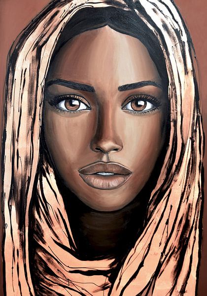"Le pouvoir de la tranquillité" capture la conscience de soi profonde et tranquille exprimée dans le portrait. L'œuvre d'art montre une femme enveloppée dans des tons chauds et terreux et dans un manteau qui évoque à la fois la protection et le mystère. Son regard est intense, mais pas impérieux, plutôt ouvert et présent. Elle ne regarde pas à travers vous, mais vers vous, d'une manière qui invite au calme et à l'attention.