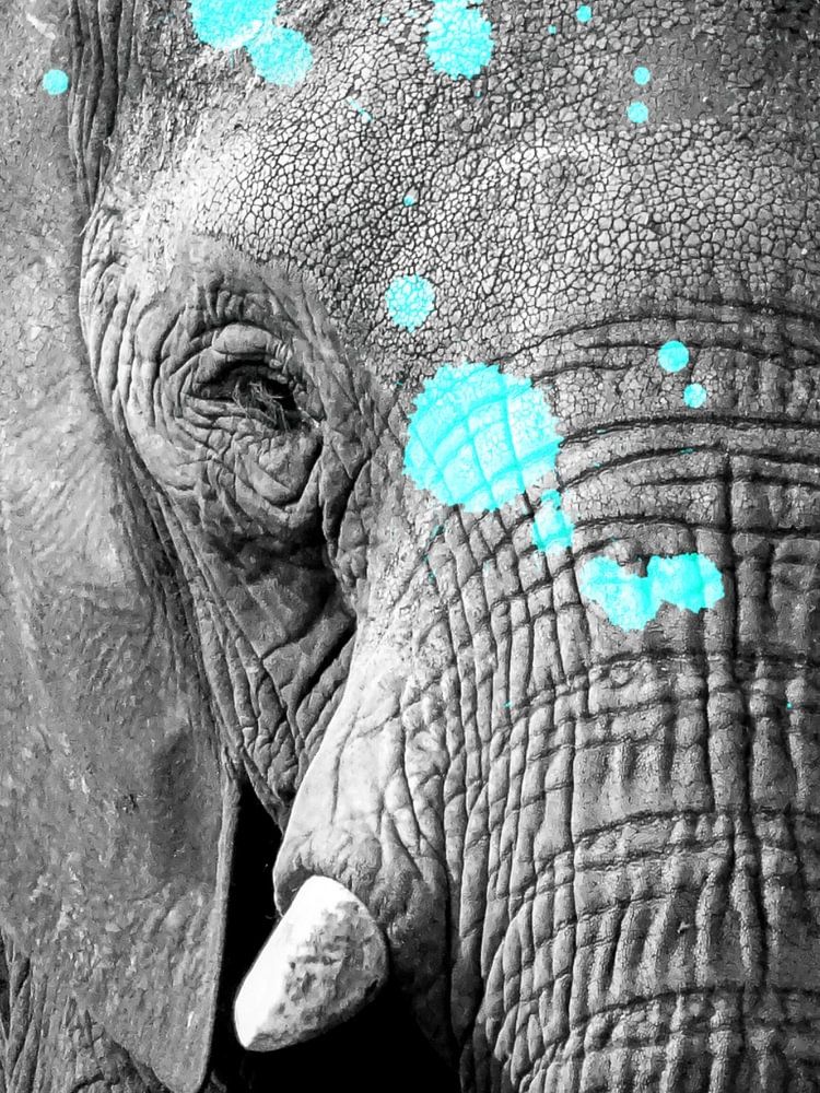 J'ai photographié moi-même cet éléphant d'Afrique, puis je lui ai donné une touche moderne en le recouvrant d'éclaboussures de peinture lumineuse. De cette façon, l'image montre la sagesse et la force, ce que l'éléphant représente, et en même temps un peu d'espièglerie grâce à la peinture appliquée. L'original sans peinture est également disponible sur ma page.