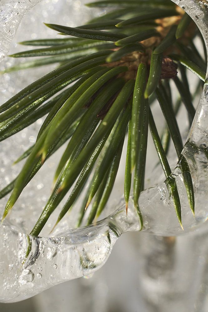 Un conifère est lentement libéré de sa couverture de glace. Un présage de temps plus chaud et un printemps qui approche