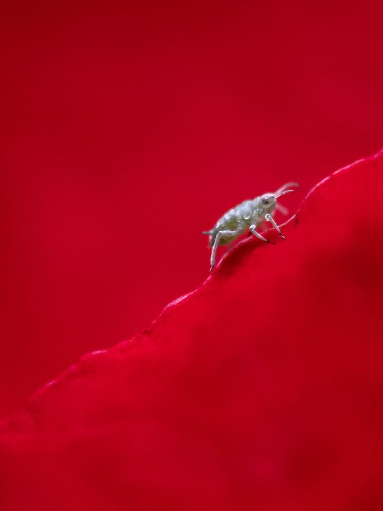 Par un temps couvert, ce puceron rapide a croisé mon appareil photo. J'ai tellement aimé le contraste avec le pétale rouge que j'ai continué à suivre la bestiole. Comme je fais toujours la mise au point manuellement, ce n'était pas une mince affaire. Au final, je suis très satisfait du résultat. Cette photo ne dépareillerait pas dans une pièce noire ou anthracite, ce qui la met bien en valeur,