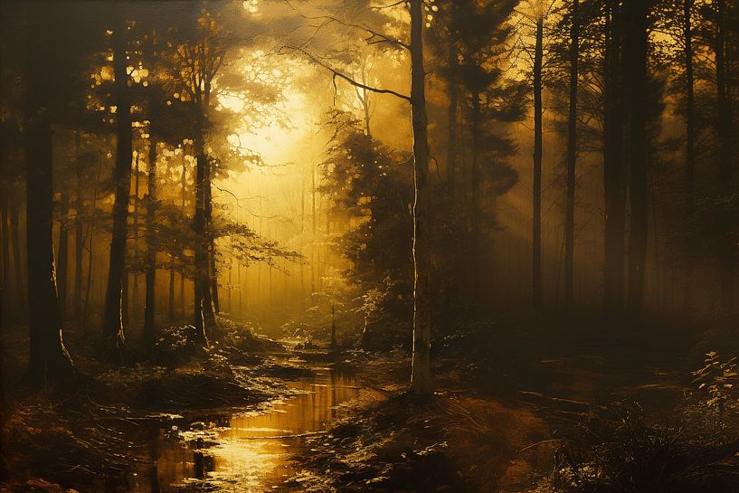 Cette œuvre d'art est parfaite pour ceux qui recherchent un rayon de lumière dans une forêt dorée, un rayon de soleil dans une forêt mystérieuse ou une décoration murale d'une forêt magique avec un ruisseau. La lueur chaude et la brume subtile créent une atmosphère de magie et de tranquillité intemporelle. Idéal au-dessus d'un canapé, d'une cheminée, d'un lit ou dans un couloir. C'est l'enchantement de la forêt à l'état pur et l'émerveillement de tous les jours sur votre mur.
