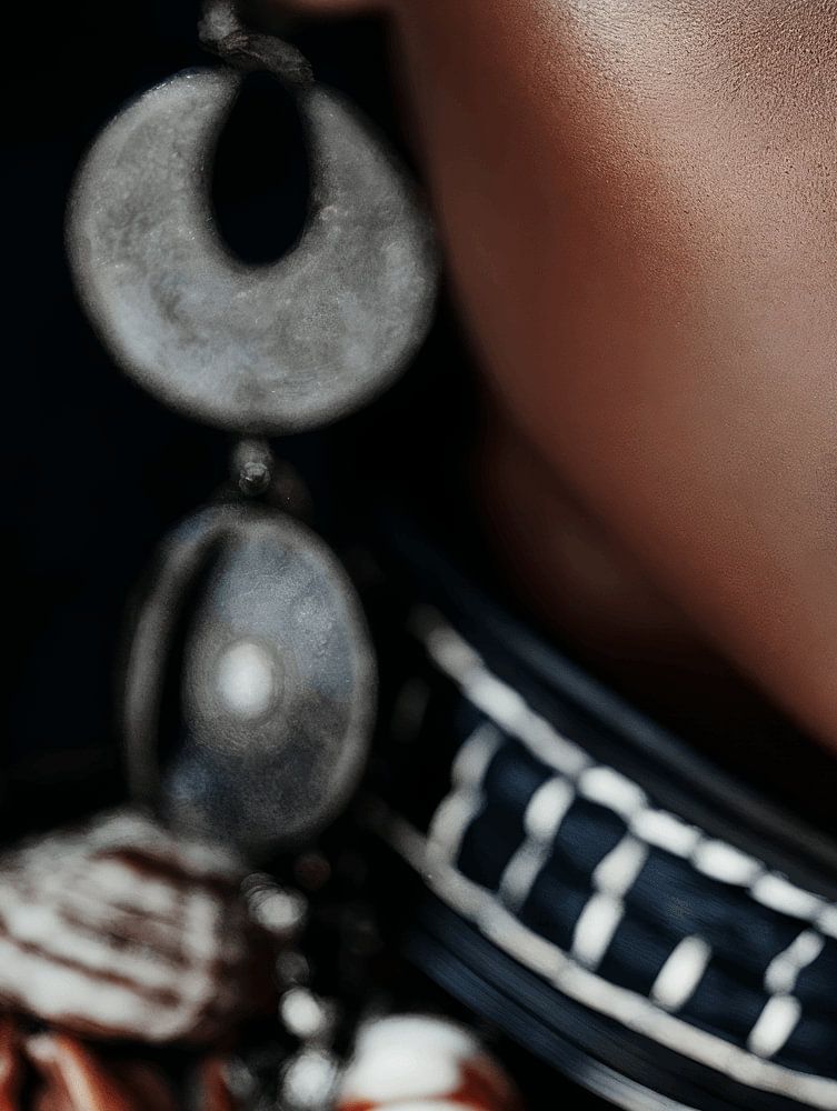 Ce portrait montre le regard intense d'une jeune femme aux yeux étonnamment clairs. Ses bijoux de coquillages et de métal donnent à l'image un aspect dur, presque rituel. Les couleurs sont profondes et chaudes, et les détails de sa peau, de ses accessoires et de son foulard vous ramènent sans cesse à l'image. Elle ne dit rien, mais son regard en dit long.