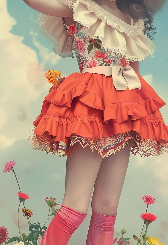 Blossom Gaze - Ce portrait féminin surréaliste montre une femme vêtue d'une tenue fleurie et colorée, entourée d'une abondance de fleurs diverses sur un fond aérien.
