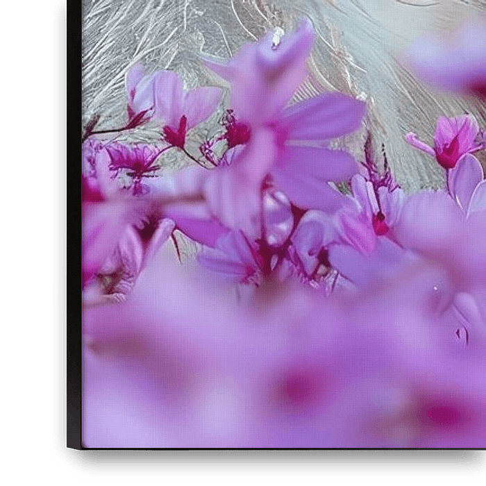 Cette œuvre d'art représente une scène sereine et enchanteresse d'un ours polaire dormant paisiblement au milieu d'une mer de fleurs violettes.