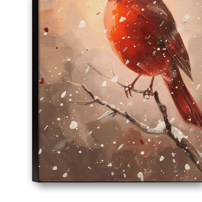 Un cardinal rouge est fièrement assis sur une branche, entouré d'une douce pluie de neige. Ses plumes éclatantes se détachent magnifiquement sur les couleurs sourdes de l'arrière-plan hivernal.