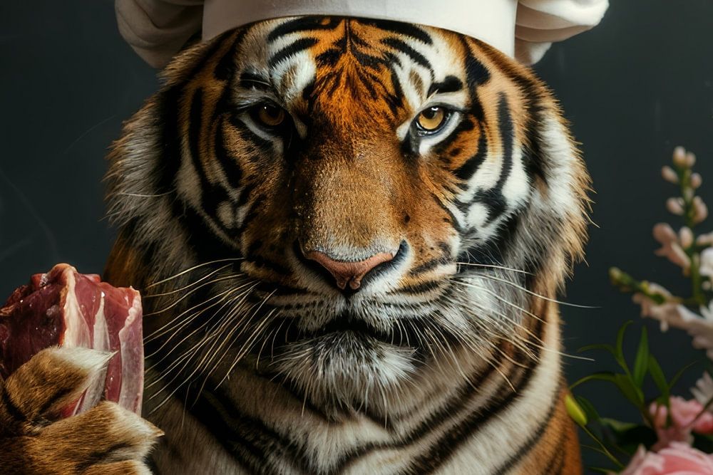 Cette œuvre d'art impressionnante représente un tigre coiffé d'une toque de chef, tenant majestueusement un morceau de viande crue, entouré de délicates roses roses. Le contraste entre la puissance brutale de l'animal carnivore et la tendresse des fleurs crée une dynamique fascinante. Le regard intense du tigre, associé au symbolisme des roses, confère à l'œuvre un sentiment à la fois de sauvagerie et d'élégance. Ce portrait saisissant attirera tous les regards des amateurs d'œuvres d'art uniques et puissantes.