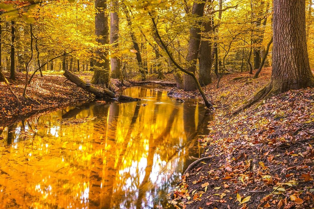 Paysage d'automne avec une forêt colorée. Paysage d'"été indien" avec des feuilles d'automne colorées d'orange, de jaune et de rouge, avec de beaux hêtres et un ruisseau au cours limpide.