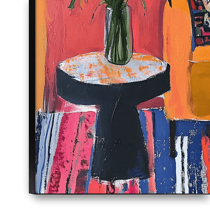 Dans cette œuvre d'art, un salon coloré prend vie dans un mélange de couleurs et de nuances vives, qui se fondent magnifiquement et évoquent une atmosphère joyeuse.