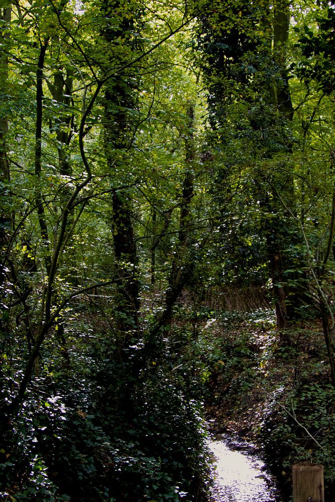 Une belle image réalisée dans la nature. Marcher dans les bois et voir un ruisseau, où le soleil brille juste à travers les arbres. Une image atmosphérique mais mystérieuse.