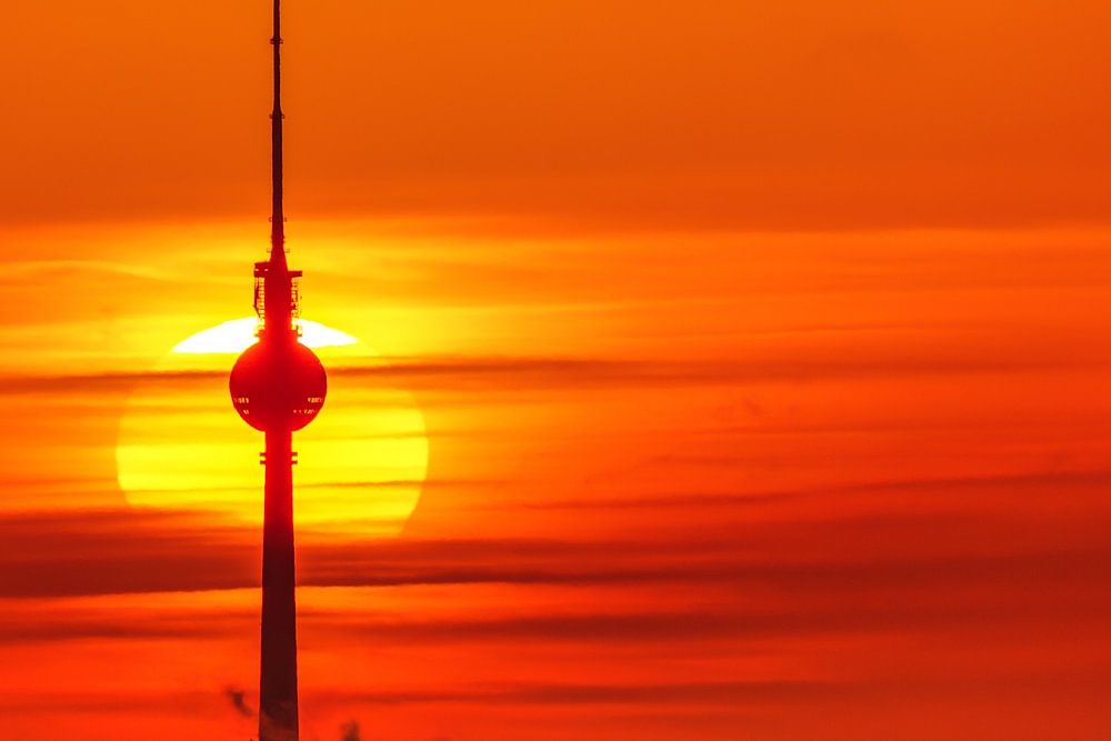 Le soleil est bas et directement derrière la tour de télévision en cette froide matinée d'automne. La silhouette de la ville se détache sur le ciel rouge