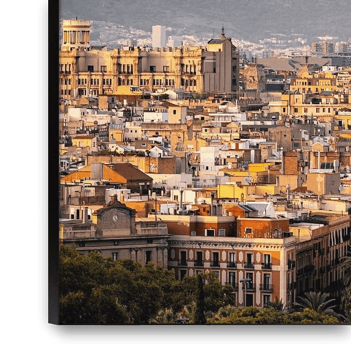 Cette œuvre d'art montre le soleil couchant sur le point de tomber sur Barcelone (Espagne). Les beaux bâtiments sont encore illuminés par la lumière du soleil. Les montagnes à l'arrière-plan donnent à la ville un sentiment de sécurité.