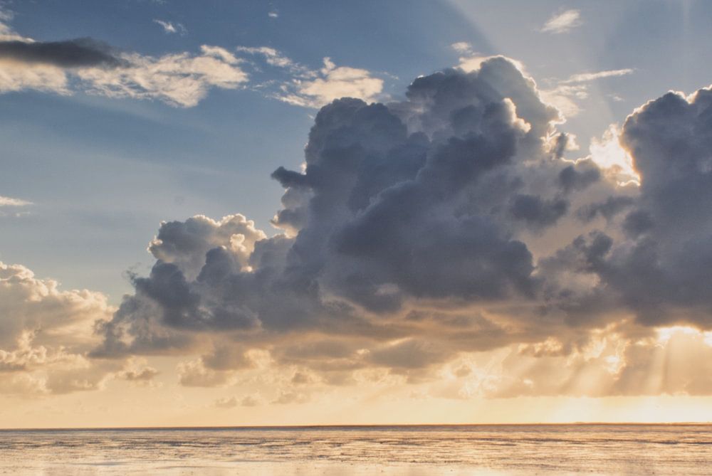 Photo de paysage prise au bord de la mer. Les rayons du soleil sortant de derrière les nuages et le reflet du ciel dans l'eau donnent un effet spécial.