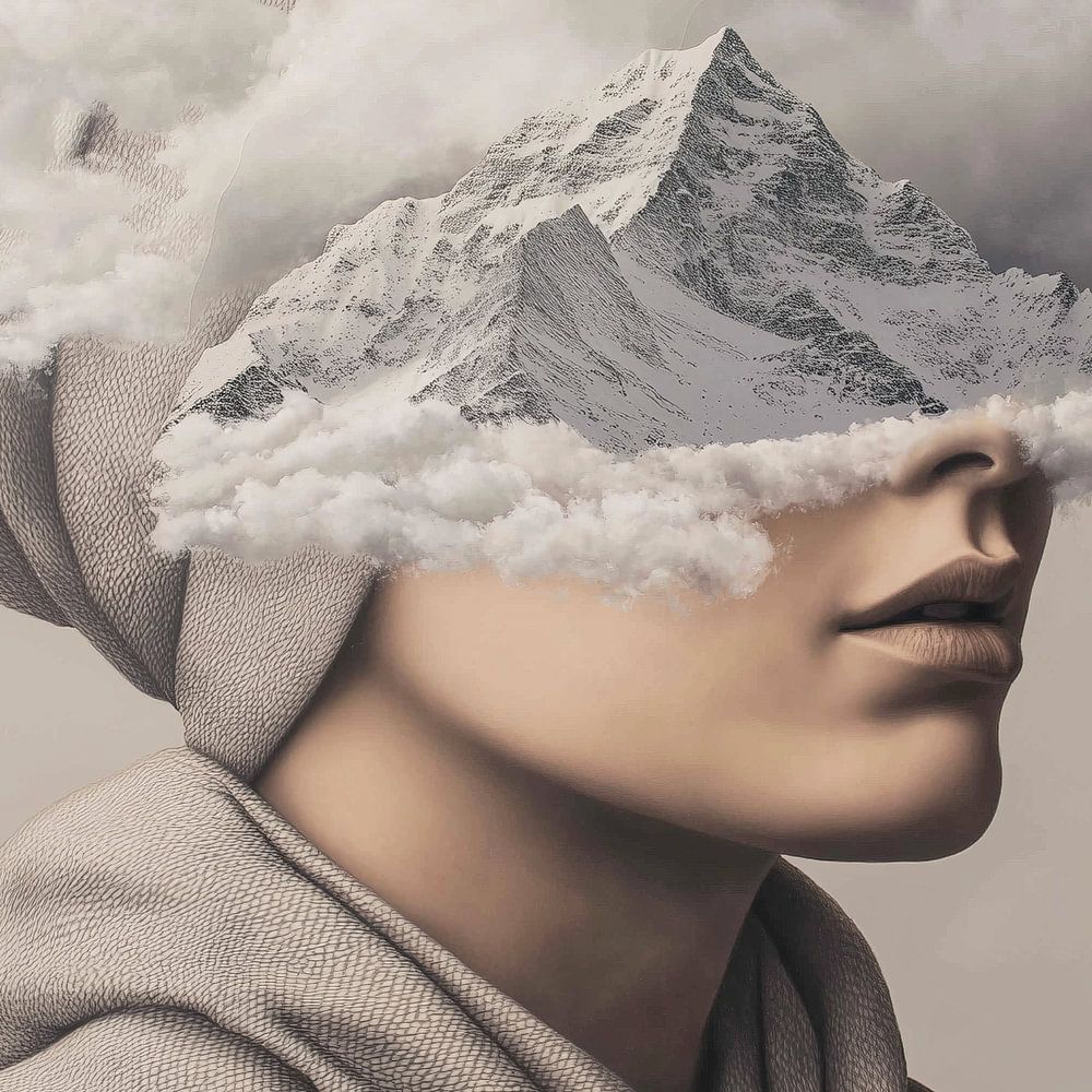 Le visage d'une femme se mêle aux nuages et au sommet d'une montagne, comme si son monde intérieur était un paysage infini.