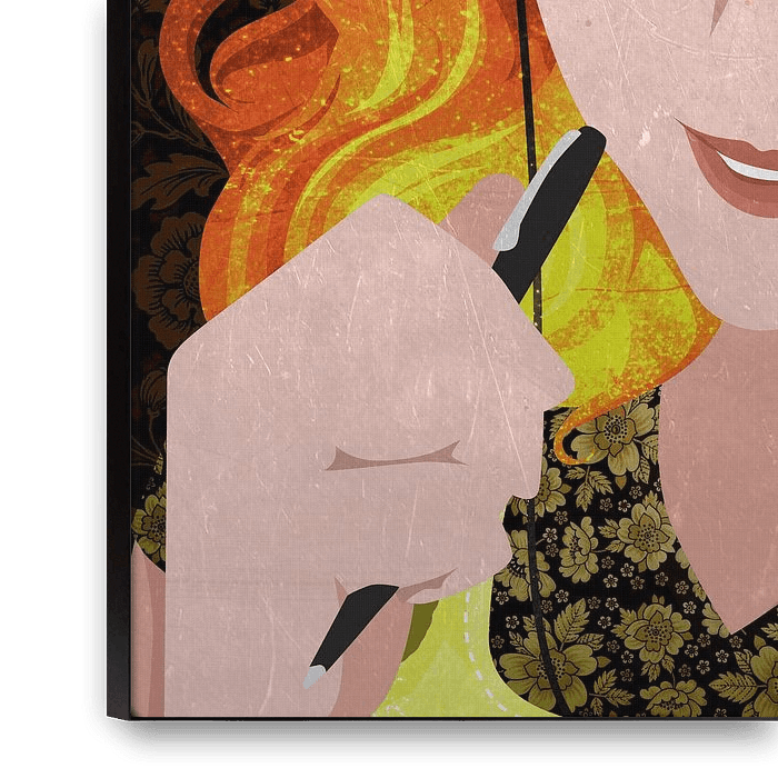 "Le son de la musique" montre une jeune fille aux longs cheveux orange qui profite d'un moment de calme pour écouter de la musique avec des écouteurs. Elle tient dans sa main un appareil de lecture de musique - une référence subtile au lien entre la technique et l'émotion. Le fond floral confère à l'image une atmosphère nostalgique,…