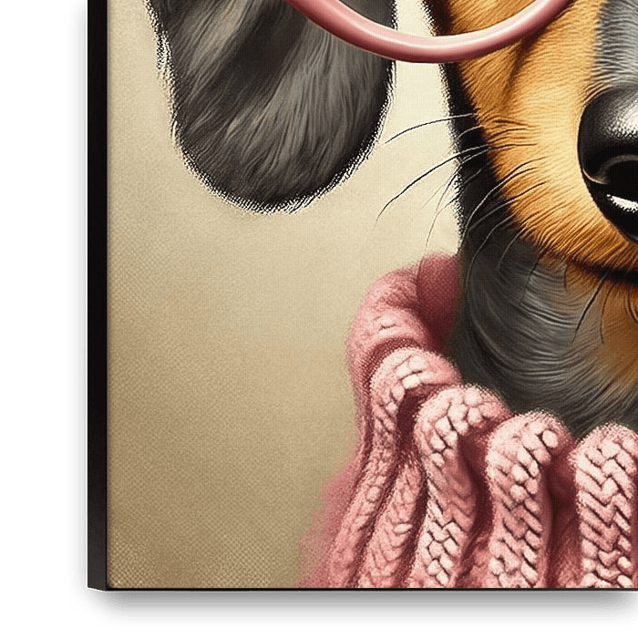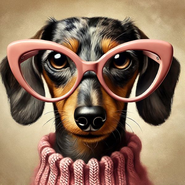 Ce teckel à poil dur est très à cheval sur la mode. Des lunettes roses en forme d'œil de chat, des tricots douillets et un look qui dit : "C'est moi qui fixe les règles ici". Un mélange de glamour vintage et d'attitude teckel qui convient parfaitement aux vrais fans de teckels.
