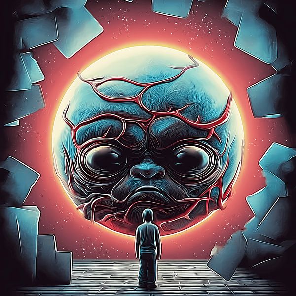 Une silhouette solitaire se tient devant une sphère colossale et sensible – mi-esprit, mi-lune – dont la surface est parcourue de pensées vivantes. Les monolithes brisés qui encadrent la scène apparaissent comme les vestiges d'une réalité brisée, figés au milieu de l'effondrement, tandis que la conscience elle-même devient l'horizon. …