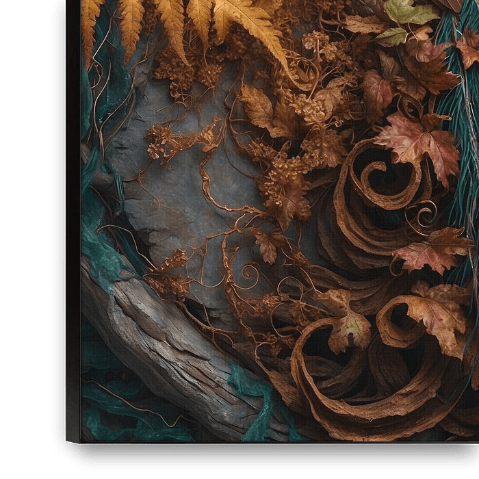 Le Trône du silence doré montre un paon en pleine splendeur, assis comme un roi dans une niche naturelle de pierres usées, de fougères enroulées et de feuilles d'automne. Ses plumes se déploient comme une tapisserie symbolique : des motifs en forme d'œil en vert émeraude, turquoise et or, encadrés par une splendeur flétrie.