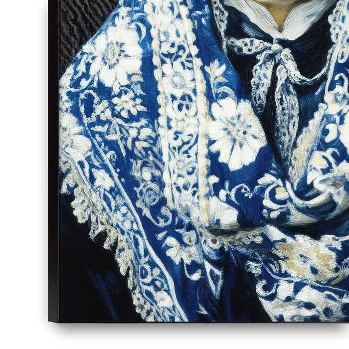 Portrait puissant et émouvant d'une femme âgée, peint dans le style d'une huile classique avec des coups de pinceau clairs et un éclairage en clair-obscur. Son visage porte les marques de la vie, tandis que le foulard bleu foncé richement brodé - inspiré des Delftware et des costumes régionaux - souligne sa dignité et sa force. Cette…