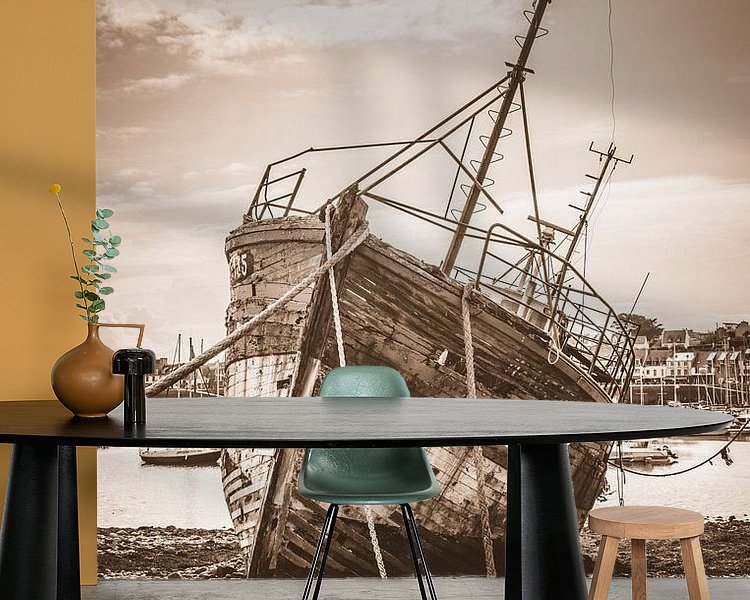 L'épave d'un voilier abandonné sur les côtes de la Bretagne.