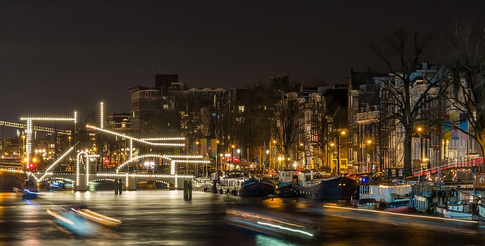 Vue sur le fleuve Amstel, qui coule la nuit, jusqu'au Magere Brug d'Amsterdam, merveilleusement éclairé par les traces lumineuses des navires de passage
