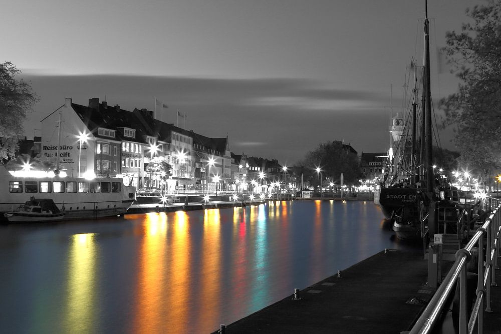 De oude binnenhaven in Emden in de schemering als gekleurde zwart-wit foto.