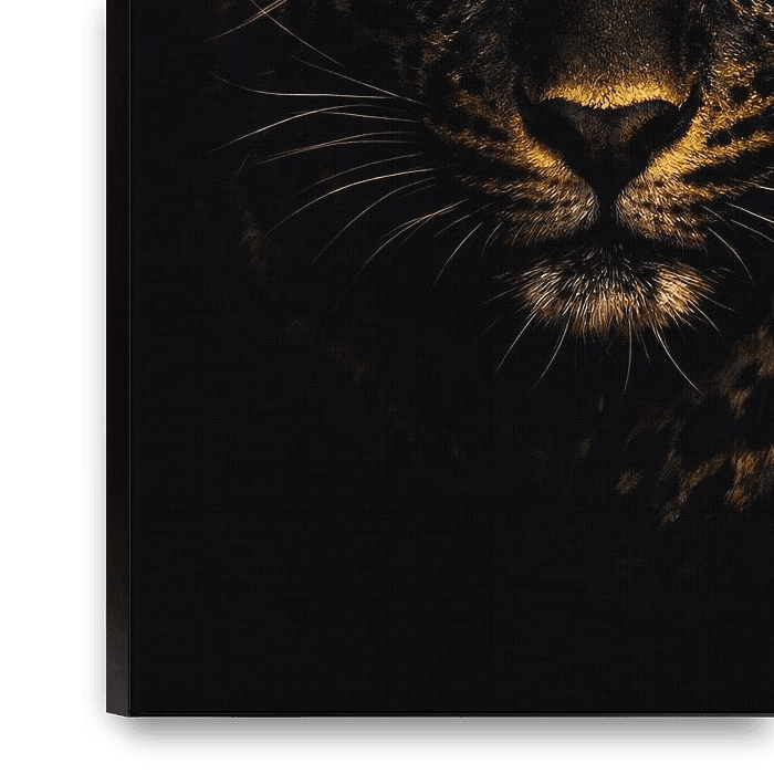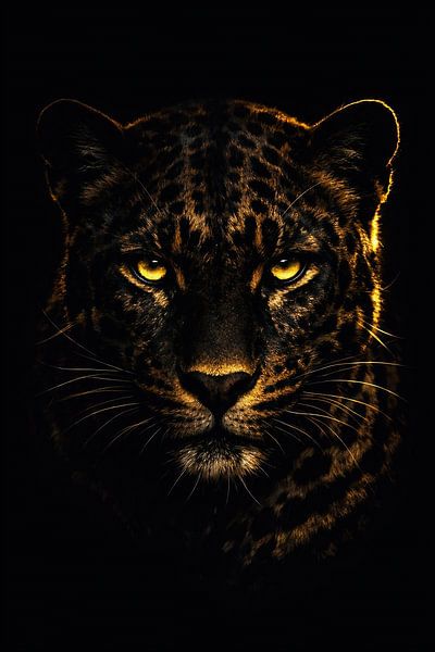 Ce portrait dramatique d'animaux sauvages présente un léopard émergeant de l'obscurité profonde, éclairé par une lumière subtile et dorée qui définit sa forme puissante. Les yeux dorés intenses expriment la concentration, la confiance et la domination tranquille, tandis que l'arrière-plan sombre renforce l'impression de mystère et de…