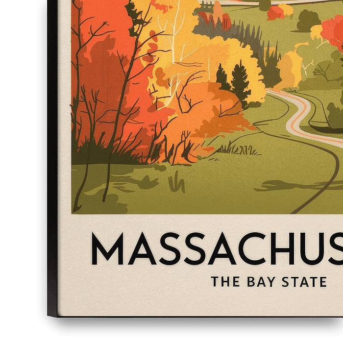 Des couleurs vives encadrent une route sinueuse qui traverse les douces collines des Berkshires, tandis que les feuilles d'automne brillent dans des tons orangés éclatants. Ce paysage harmonieux donne un sentiment d'aventure et de calme - parfait pour le salon afin de dégager un sentiment de bien-être et de proximité avec la nature.