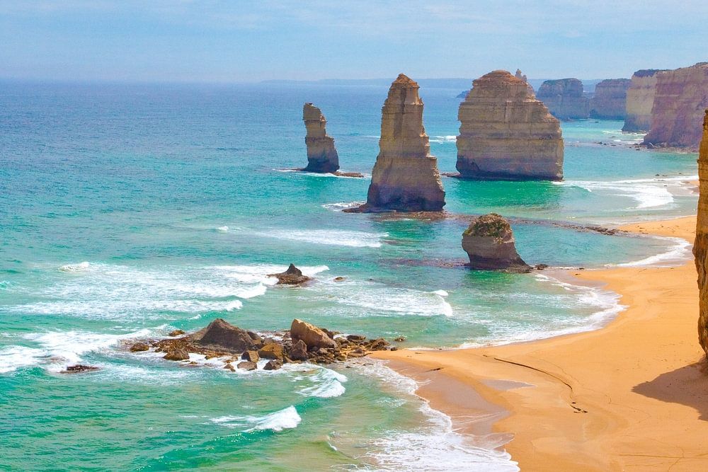 Un littoral à couper le souffle avec des formations rocheuses calcaires emblématiques émergeant des eaux turquoises de la Great Ocean Road. Ces sites naturels spectaculaires, formés par des millions d'années d'érosion par le vent et les vagues, se dressent fièrement sur fond de ciel bleu et de vagues qui roulent doucement. Les sables dorés contrastent magnifiquement avec la côte rocheuse accidentée, créant un paysage à couper le souffle qui capture parfaitement la beauté de la côte sud de l'Australie.