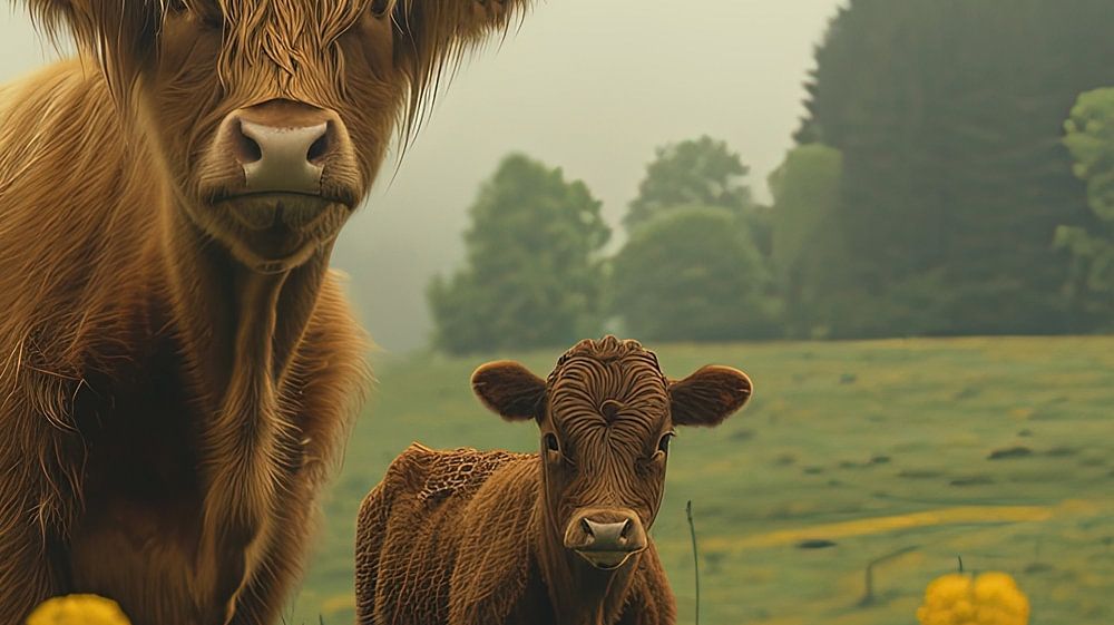 La lumière chaude du soleil et la douce brume créent une atmosphère de calme et de paix. La mère se tient de manière protectrice près de son petit, ses cornes impressionnantes et son pelage hirsute contrastant fortement avec la douceur du paysage. L'expression de son visage semble à la fois douce et vigilante, un regard qui semble plonger dans l'âme de l'observateur. Le veau se tient près d'elle, cherchant la sécurité auprès de sa mère.