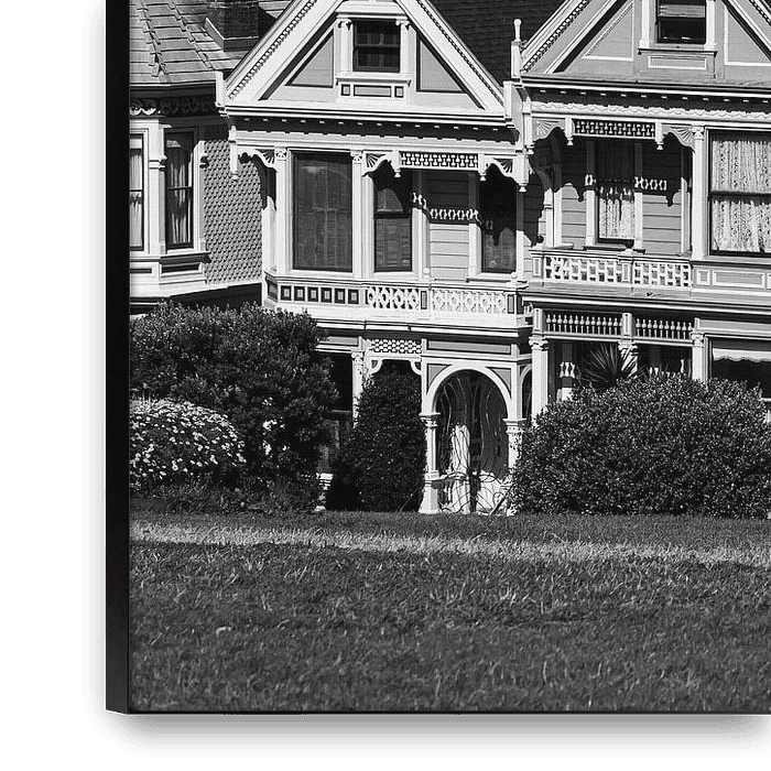 Une photographie en noir et blanc d'Alamo Square, un parc et un quartier de San Francisco. Sur le côté est du parc se trouvent les six célèbres maisons victoriennes de la rue Steiner, connues sous le nom de "Painted Ladies".